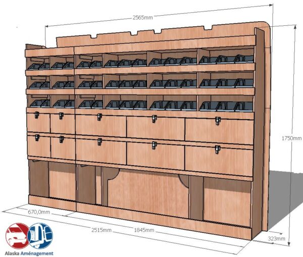 Ce meuble de rangement KRD102-N(pour le latéral « Droite » de votre véhicule) offre une solution de stockage polyvalente et fonctionnelle avec sept niveaux de stockage. Il comprend des étagères pour bacs à bec et des clapets basculants. Une étagère supérieure est conçue pour les objets longs. Son fond arrière intégré assure la rigidité et protège la carrosserie du véhicule, évitant un habillage supplémentaire. Le meuble est disponible en contreplaqué brut ou filmé.