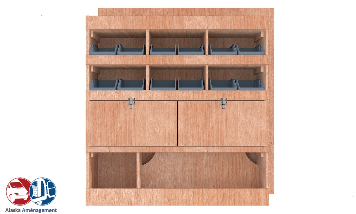 Ce meuble de rangement KRD102-N (pour le latéral « Droite » de votre véhicule) offre une solution de stockage polyvalente et fonctionnelle avec cinq niveaux de stockage. Il comprend des étagères pour bacs à bec et des clapets basculants. Une étagère supérieure est conçue pour les objets longs. Son fond arrière intégré assure la rigidité et protège la carrosserie du véhicule, évitant un habillage supplémentaire. Le meuble est disponible en contreplaqué brut ou filmé.