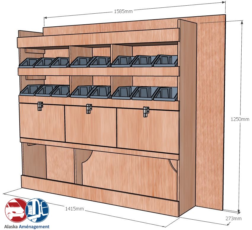 Ce meuble de rangement KRD102-N (pour le latéral « Droite » de votre véhicule) offre une solution de stockage polyvalente et fonctionnelle avec cinq niveaux de stockage. Il comprend des étagères pour bacs à bec et des clapets basculants. Une étagère supérieure est conçue pour les objets longs. Son fond arrière intégré assure la rigidité et protège la carrosserie du véhicule, évitant un habillage supplémentaire. Le meuble est disponible en contreplaqué brut ou filmé.