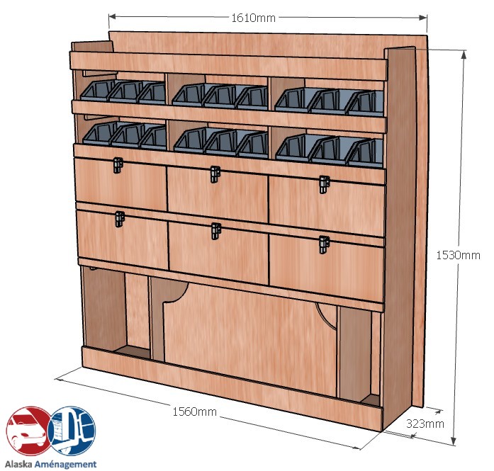Ce meuble de rangement KRD102-N (pour le latéral « Droite » de votre véhicule) offre une solution de stockage polyvalente et fonctionnelle avec six niveaux de stockage. Il comprend des étagères pour bacs à bec et des clapets basculants. Une étagère supérieure est conçue pour les objets longs. Son fond arrière intégré assure la rigidité et protège la carrosserie du véhicule, évitant un habillage supplémentaire. Le meuble est disponible en contreplaqué brut ou filmé. |