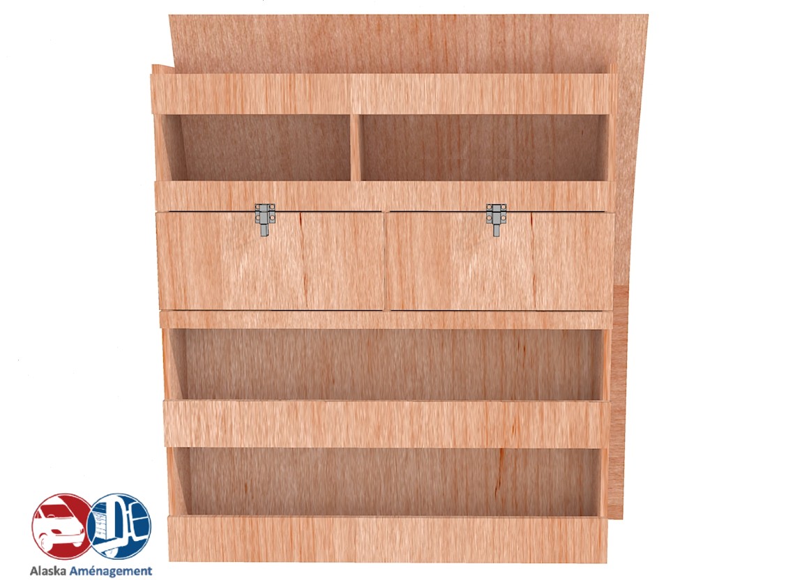 Ce meuble de rangement KRD102-N (pour le latéral « Droite » de votre véhicule) offre une solution de stockage polyvalente et fonctionnelle avec cinq niveaux de stockage. Il comprend des étagères pour bacs à bec et des clapets basculants. Une étagère supérieure est conçue pour les objets longs. Son fond arrière intégré assure la rigidité et protège la carrosserie du véhicule, évitant un habillage supplémentaire. Le meuble est disponible en contreplaqué brut ou filmé. |