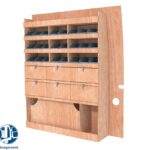 Ce meuble de rangement KRD102-N (pour le latéral « Droite » de votre véhicule) offre une solution de stockage polyvalente et fonctionnelle avec sept niveaux de stockage. Il comprend des étagères pour bacs à bec et des clapets basculants. Une étagère supérieure est conçue pour les objets longs. Son fond arrière intégré assure la rigidité et protège la carrosserie du véhicule, évitant un habillage supplémentaire. Le meuble est disponible en contreplaqué brut ou filmé.