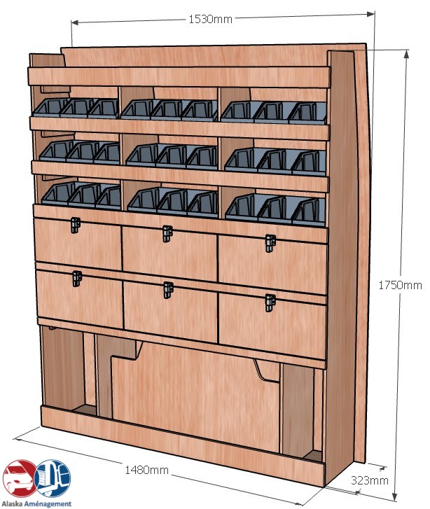 Ce meuble de rangement KRD102-N (pour le latéral « Droite » de votre véhicule) offre une solution de stockage polyvalente et fonctionnelle avec sept niveaux de stockage. Il comprend des étagères pour bacs à bec et des clapets basculants. Une étagère supérieure est conçue pour les objets longs. Son fond arrière intégré assure la rigidité et protège la carrosserie du véhicule, évitant un habillage supplémentaire. Le meuble est disponible en contreplaqué brut ou filmé. |