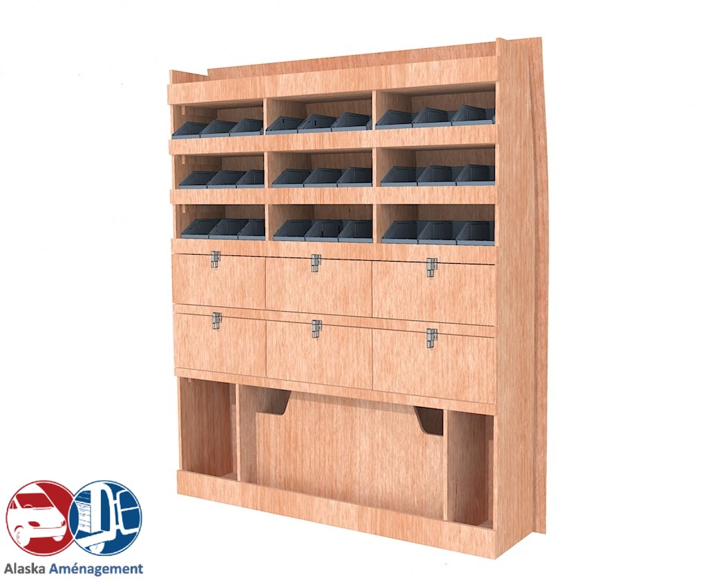 Ce meuble de rangement KRD102-N (pour le latéral « Droite » de votre véhicule) offre une solution de stockage polyvalente et fonctionnelle avec sept niveaux de stockage. Il comprend des étagères pour bacs à bec et des clapets basculants. Une étagère supérieure est conçue pour les objets longs. Son fond arrière intégré assure la rigidité et protège la carrosserie du véhicule, évitant un habillage supplémentaire. Le meuble est disponible en contreplaqué brut ou filmé.