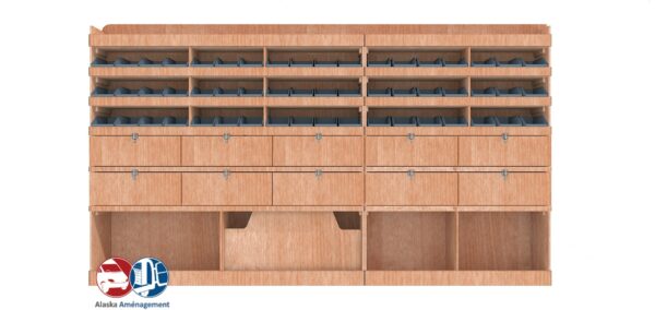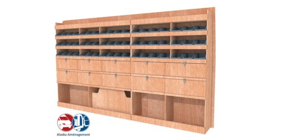 Ce meuble de rangement KRD102-N(pour le latéral « Droite » de votre véhicule) offre une solution de stockage polyvalente et fonctionnelle avec sept niveaux de stockage. Il comprend des étagères pour bacs à bec et des clapets basculants. Une étagère supérieure est conçue pour les objets longs. Son fond arrière intégré assure la rigidité et protège la carrosserie du véhicule, évitant un habillage supplémentaire. Le meuble est disponible en contreplaqué brut ou filmé.