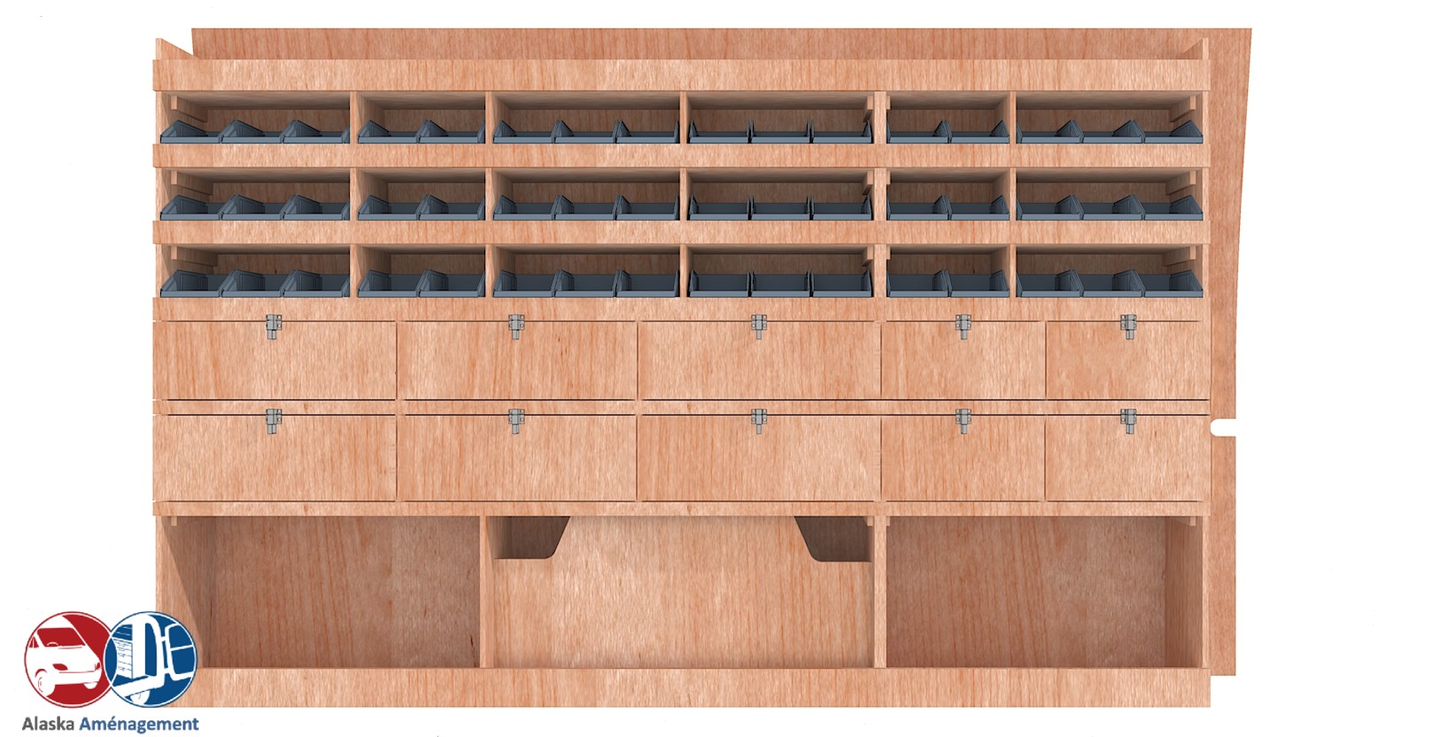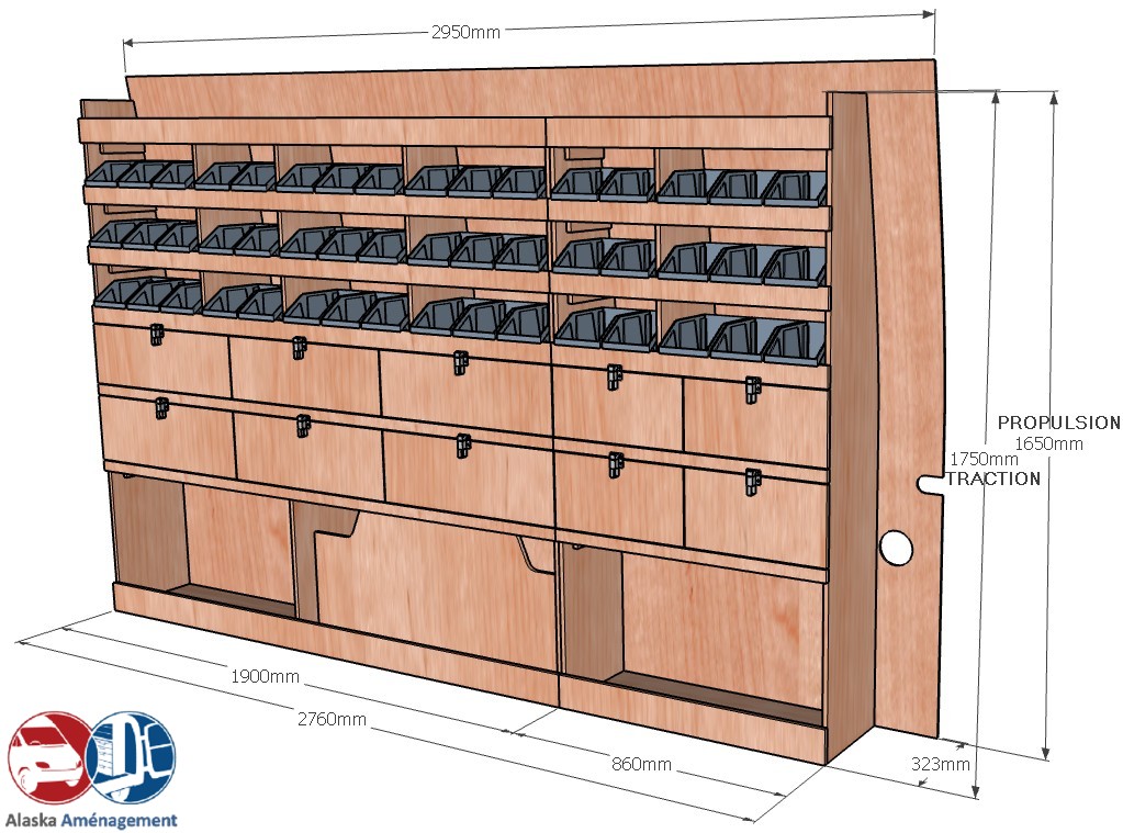 Ce meuble de rangement KRD102-N (pour le latéral « Droite » de votre véhicule) offre une solution de stockage polyvalente et fonctionnelle avec sept niveaux de stockage. Il comprend des étagères pour bacs à bec et des clapets basculants. Une étagère supérieure est conçue pour les objets longs. Son fond arrière intégré assure la rigidité et protège la carrosserie du véhicule, évitant un habillage supplémentaire. Le meuble est disponible en contreplaqué brut ou filmé. |