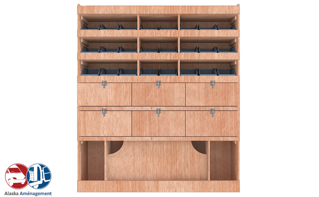 Ce meuble de rangement KRD102-N (pour le latéral « Droite » de votre véhicule) offre une solution de stockage polyvalente et fonctionnelle avec sept niveaux de stockage. Il comprend des étagères pour bacs à bec et des clapets basculants. Une étagère supérieure est conçue pour les objets longs. Son fond arrière intégré assure la rigidité et protège la carrosserie du véhicule, évitant un habillage supplémentaire. Le meuble est disponible en contreplaqué brut ou filmé. |