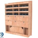 Ce meuble de rangement KRD102-N (pour le latéral « Droite » de votre véhicule) offre une solution de stockage polyvalente et fonctionnelle avec sept niveaux de stockage. Il comprend des étagères pour bacs à bec et des clapets basculants. Une étagère supérieure est conçue pour les objets longs. Son fond arrière intégré assure la rigidité et protège la carrosserie du véhicule, évitant un habillage supplémentaire. Le meuble est disponible en contreplaqué brut ou filmé.