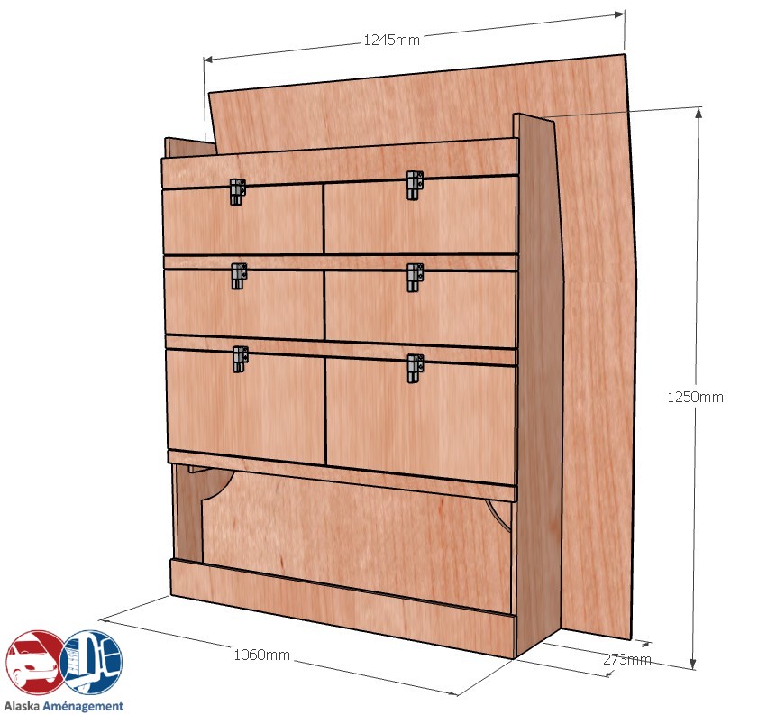 Ce meuble de rangement KRD103-N (pour le latéral « Droite » de votre véhicule) offre une solution de stockage fonctionnelle avec cinq niveaux de stockage. Il comprend trois niveaux de clapets basculants. Une étagère supérieure est conçue pour les objets longs. Son fond arrière intégré assure la rigidité et protège la carrosserie du véhicule, évitant un habillage supplémentaire. Le meuble est disponible en contreplaqué brut ou filmé. |