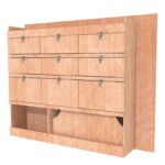 Ce meuble de rangement KRD103-N (pour le latéral « Droite » de votre véhicule) offre une solution de stockage fonctionnelle avec cinq niveaux de stockage. Il comprend trois niveaux de clapets basculants. Une étagère supérieure est conçue pour les objets longs. Son fond arrière intégré assure la rigidité et protège la carrosserie du véhicule, évitant un habillage supplémentaire. Le meuble est disponible en contreplaqué brut ou filmé.