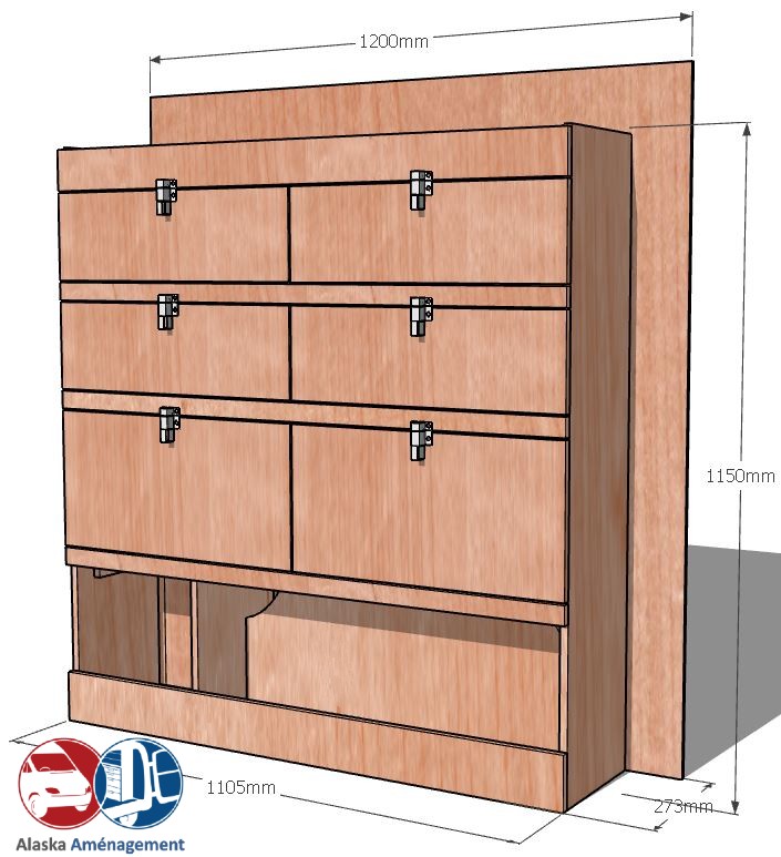 Ce meuble de rangement KRD103-N (pour le latéral « Droite » de votre véhicule) offre une solution de stockage fonctionnelle avec cinq niveaux de stockage. Il comprend trois niveaux de clapets basculants. Une étagère supérieure est conçue pour les objets longs. Son fond arrière intégré assure la rigidité et protège la carrosserie du véhicule, évitant un habillage supplémentaire. Le meuble est disponible en contreplaqué brut ou filmé. |