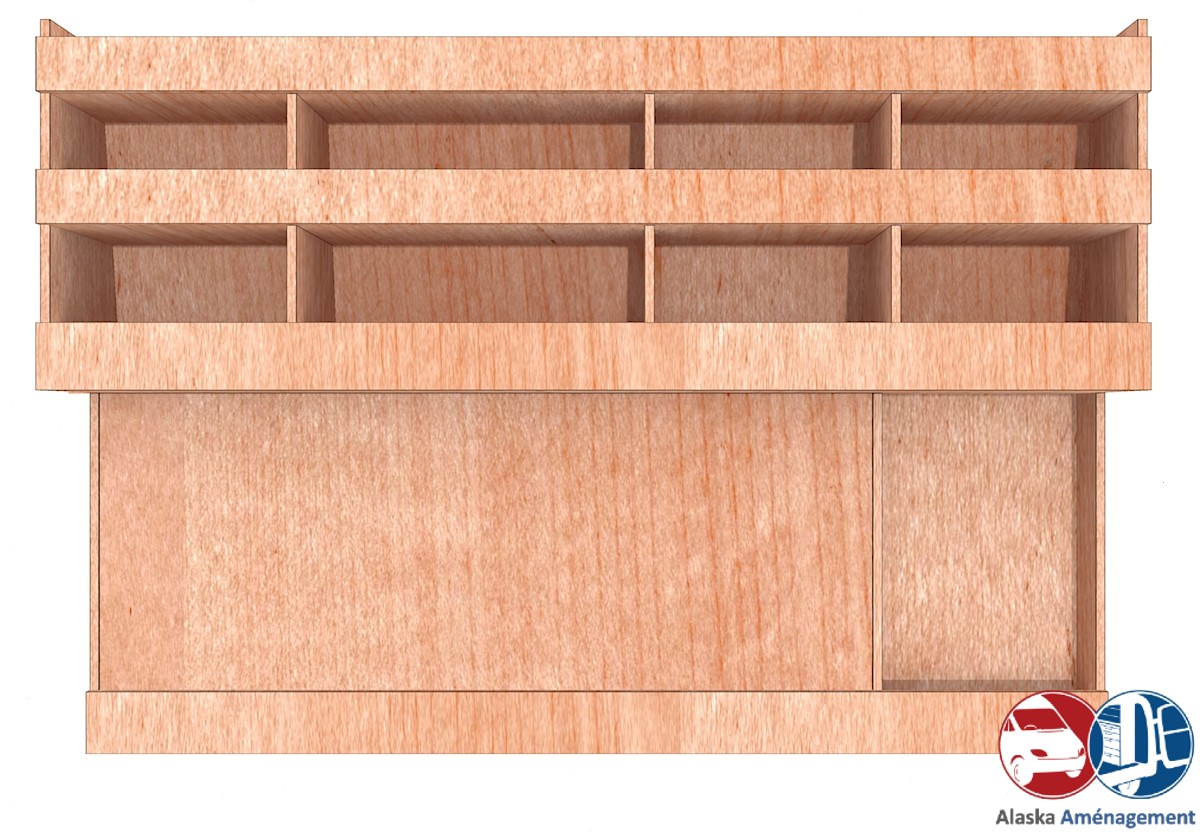 Ce meuble de rangement KRG-DC-N (pour le latéral « Gauche » de votre véhicule) offre une solution de stockage polyvalente et fonctionnelle avec trois niveaux de stockage. Il comprend des étagères pour stocker divers équipements et matériels. Une étagère supérieure est conçue pour les objets longs. Son fond arrière intégré et sa protection de passage de roue assurent la rigidité et protège la carrosserie du véhicule, évitant un habillage supplémentaire. Le meuble est disponible en contreplaqué brut ou filmé.