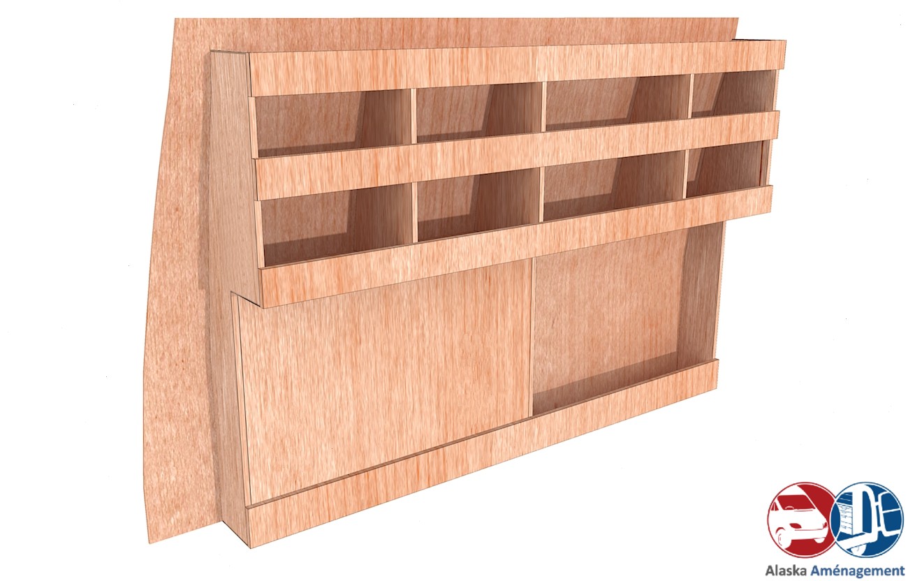 Ce meuble de rangement KRG-DC-N(pour le latéral « Gauche » de votre véhicule) offre une solution de stockage polyvalente et fonctionnelle avec trois niveaux de stockage. Il comprend des étagères pour stocker divers équipements et matériels. Une étagère supérieure est conçue pour les objets longs. Son fond arrière intégré et sa protection de passage de roue assurent la rigidité et protège la carrosserie du véhicule, évitant un habillage supplémentaire. Le meuble est disponible en contreplaqué brut ou filmé.