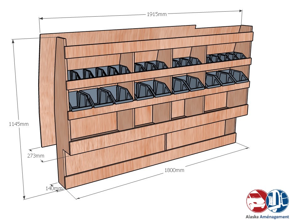 Ce meuble de rangement KRG-DC001-N (pour le latéral « Gauche » de votre véhicule) offre une solution de stockage polyvalente et fonctionnelle avec trois niveaux de stockage. Il comprend des étagères pour bacs à bec pour ranger toutes vos petites pièces. Une étagère supérieure est conçue pour les objets longs. Son fond arrière intégré et sa protection de passage de roue assurent la rigidité et protège la carrosserie du véhicule, évitant un habillage supplémentaire. Le meuble est disponible en contreplaqué brut ou filmé.