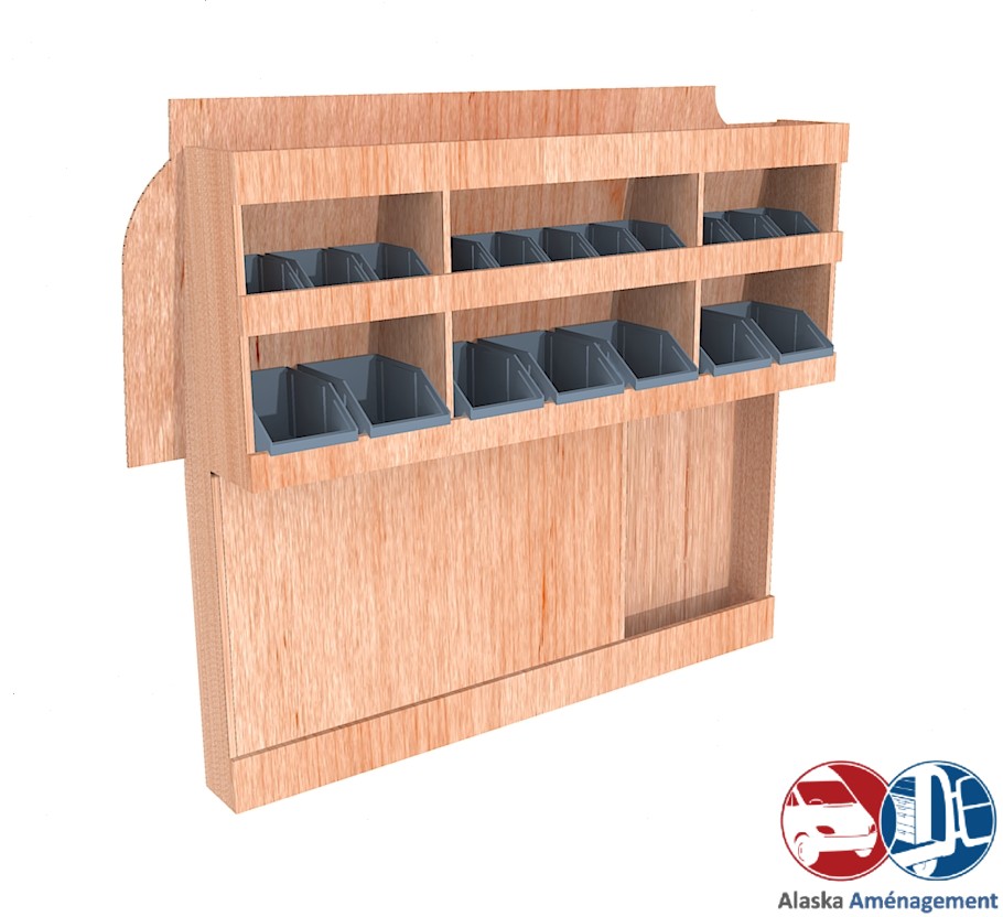Ce meuble de rangement KRG-DC001-N (pour le latéral « Gauche » de votre véhicule) offre une solution de stockage polyvalente et fonctionnelle avec trois niveaux de stockage. Il comprend des étagères pour bacs à bec pour ranger toutes vos petites pièces. Une étagère supérieure est conçue pour les objets longs. Son fond arrière intégré et sa protection de passage de roue assurent la rigidité et protège la carrosserie du véhicule, évitant un habillage supplémentaire. Le meuble est disponible en contreplaqué brut ou filmé. |
