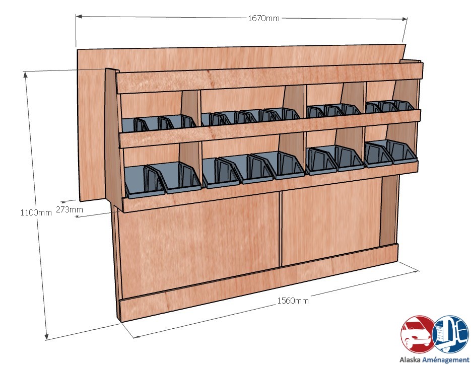 Ce meuble de rangement KRG-DC001-N (pour le latéral « Gauche » de votre véhicule) offre une solution de stockage polyvalente et fonctionnelle avec trois niveaux de stockage. Il comprend des étagères pour bacs à bec pour ranger toutes vos petites pièces. Une étagère supérieure est conçue pour les objets longs. Son fond arrière intégré et sa protection de passage de roue assurent la rigidité et protège la carrosserie du véhicule, évitant un habillage supplémentaire. Le meuble est disponible en contreplaqué brut ou filmé.