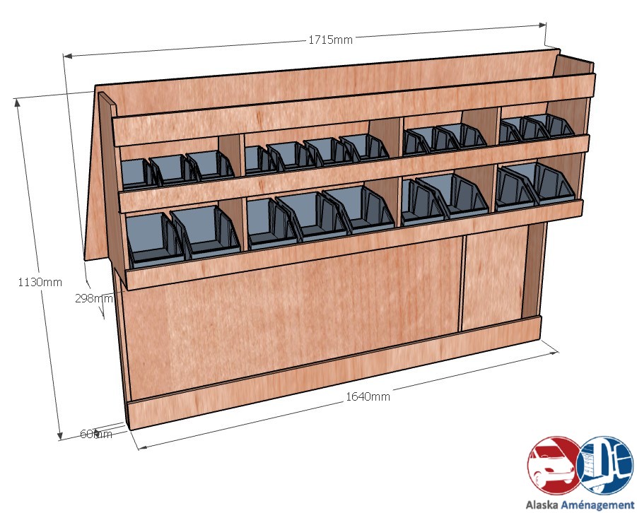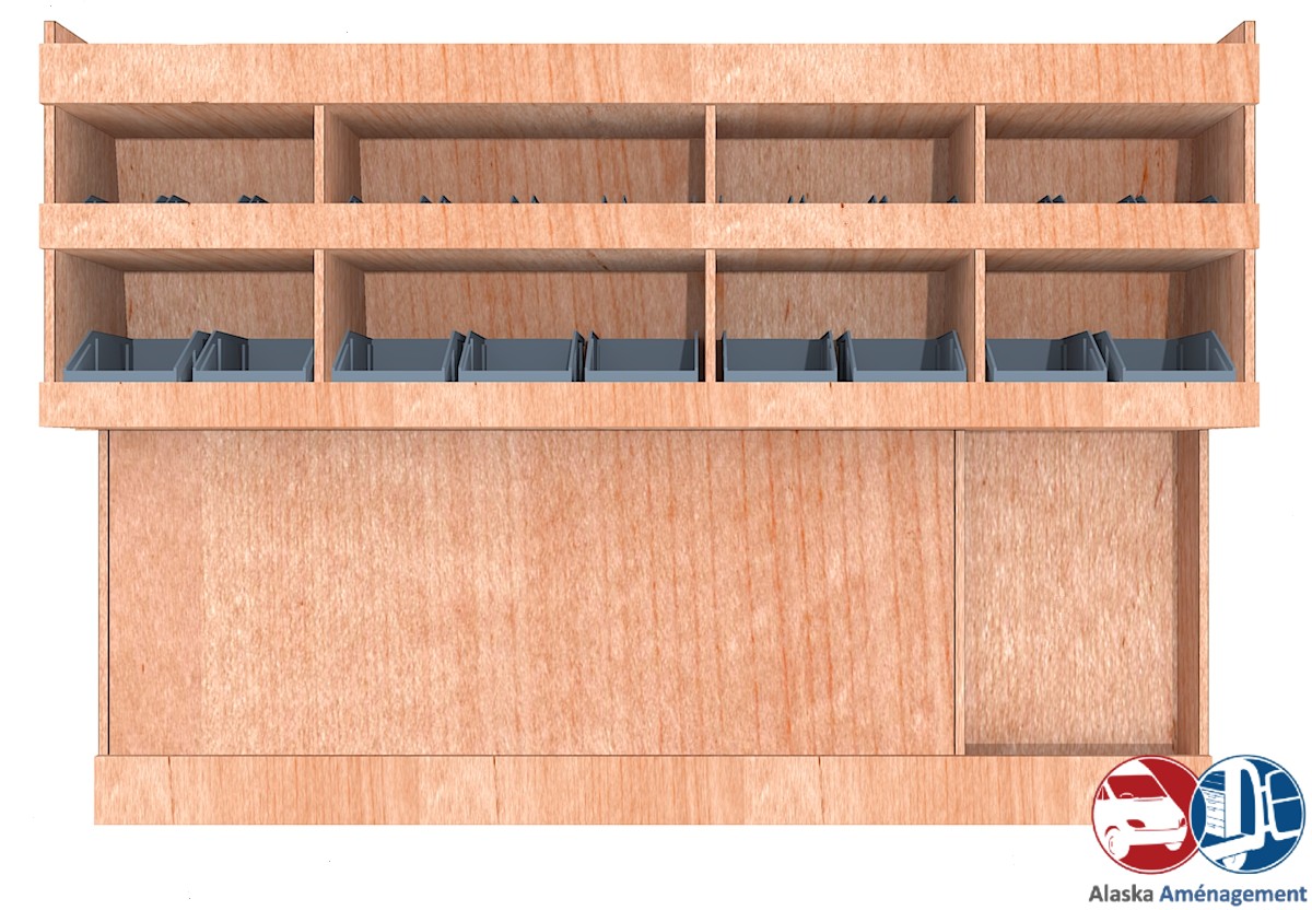 Ce meuble de rangement KRG-DC001-N (pour le latéral « Gauche » de votre véhicule) offre une solution de stockage polyvalente et fonctionnelle avec trois niveaux de stockage. Il comprend des étagères pour bacs à bec pour ranger toutes vos petites pièces. Une étagère supérieure est conçue pour les objets longs. Son fond arrière intégré et sa protection de passage de roue assurent la rigidité et protège la carrosserie du véhicule, évitant un habillage supplémentaire. Le meuble est disponible en contreplaqué brut ou filmé.