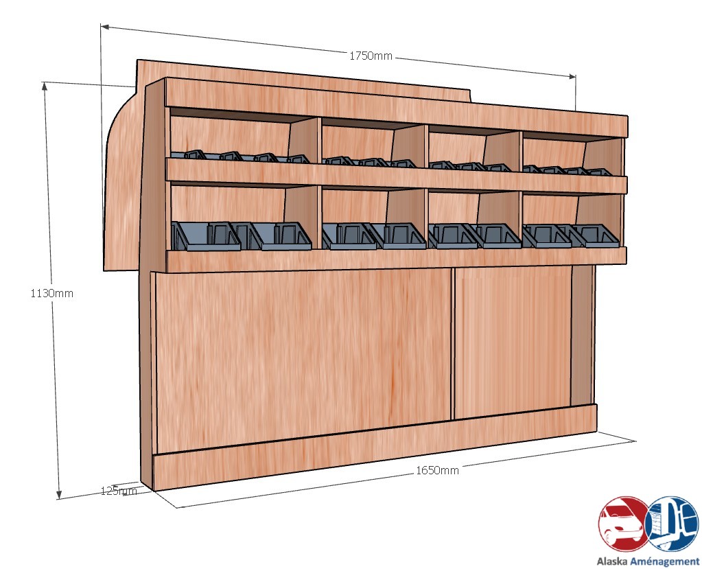 Ce meuble de rangement KRG-DC001-N (pour le latéral « Gauche » de votre véhicule) offre une solution de stockage polyvalente et fonctionnelle avec trois niveaux de stockage. Il comprend des étagères pour bacs à bec pour ranger toutes vos petites pièces. Une étagère supérieure est conçue pour les objets longs. Son fond arrière intégré et sa protection de passage de roue assurent la rigidité et protège la carrosserie du véhicule, évitant un habillage supplémentaire. Le meuble est disponible en contreplaqué brut ou filmé.