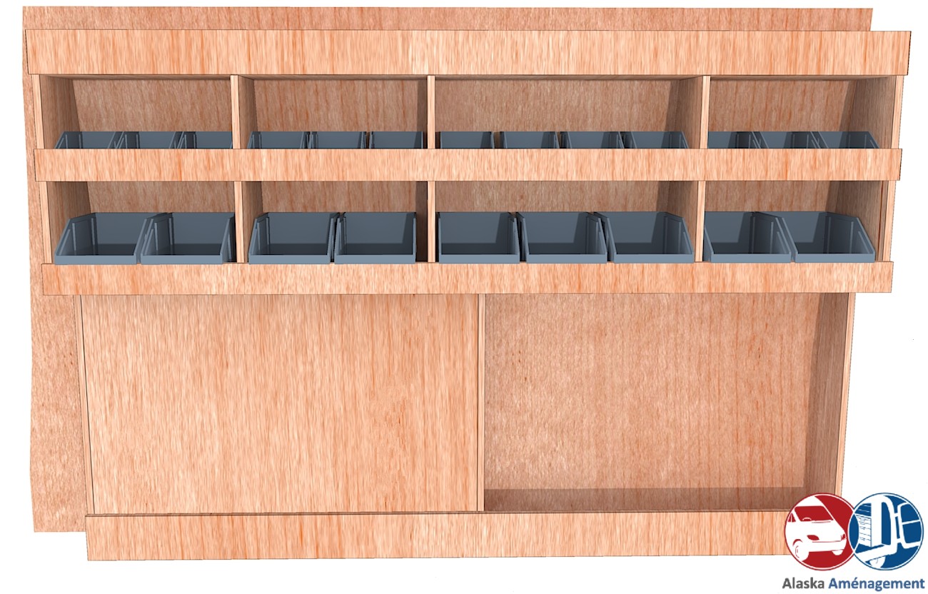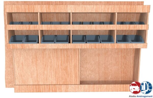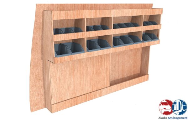 Ce meuble de rangement KRG-DC001-N (pour le latéral « Gauche » de votre véhicule) offre une solution de stockage polyvalente et fonctionnelle avec trois niveaux de stockage. Il comprend des étagères pour bacs à bec pour ranger toutes vos petites pièces. Une étagère supérieure est conçue pour les objets longs. Son fond arrière intégré et sa protection de passage de roue assurent la rigidité et protège la carrosserie du véhicule, évitant un habillage supplémentaire. Le meuble est disponible en contreplaqué brut ou filmé.