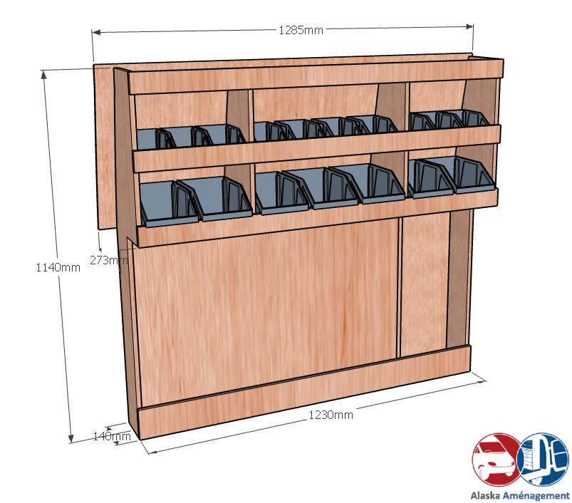Ce meuble de rangement KRG-DC001-N (pour le latéral « Gauche » de votre véhicule) offre une solution de stockage polyvalente et fonctionnelle avec trois niveaux de stockage. Il comprend des étagères pour bacs à bec pour ranger toutes vos petites pièces. Une étagère supérieure est conçue pour les objets longs. Son fond arrière intégré et sa protection de passage de roue assurent la rigidité et protège la carrosserie du véhicule, évitant un habillage supplémentaire. Le meuble est disponible en contreplaqué brut ou filmé.
