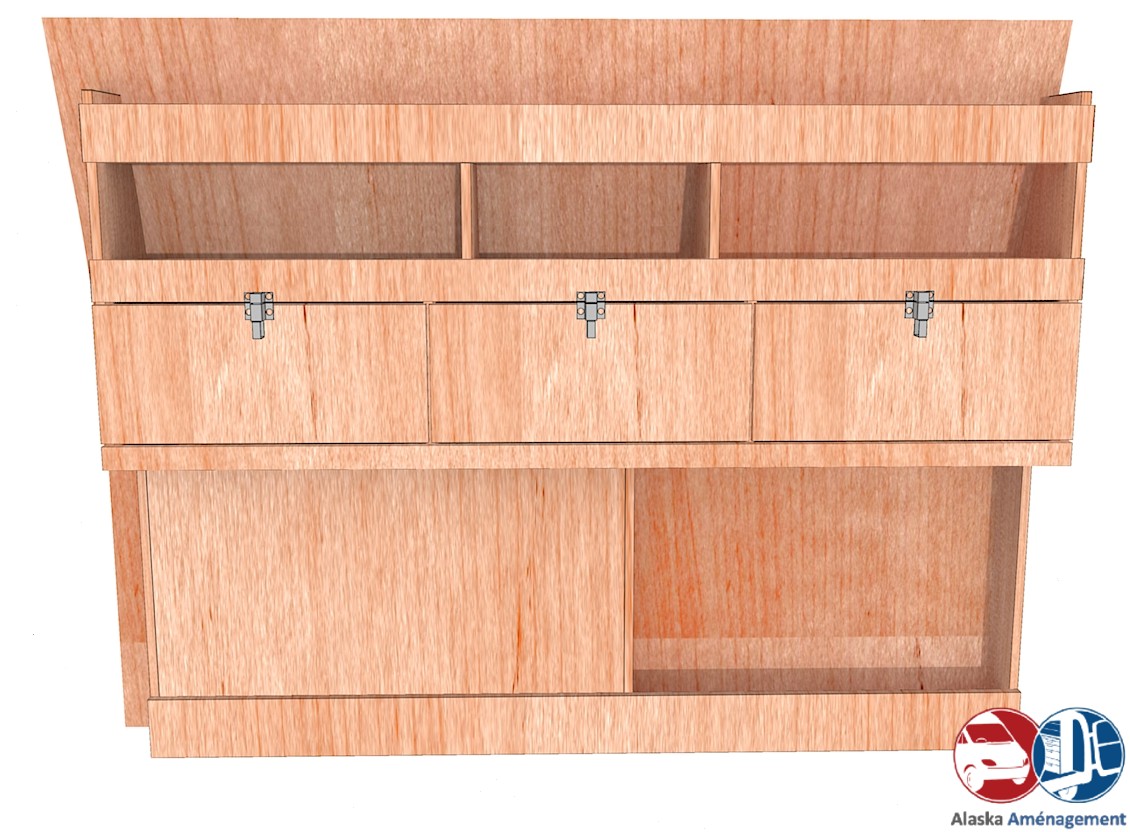 Ce meuble de rangement KRG-DC002-N (pour le latéral « Gauche » de votre véhicule) offre une solution de stockage polyvalente et fonctionnelle avec trois niveaux de stockage. Il comprend des clapets basculants. Une étagère supérieure est conçue pour les objets longs. Son fond arrière intégré et sa protection de passage de roue assurent la rigidité et protège la carrosserie du véhicule, évitant un habillage supplémentaire. Le meuble est disponible en contreplaqué brut ou filmé. |