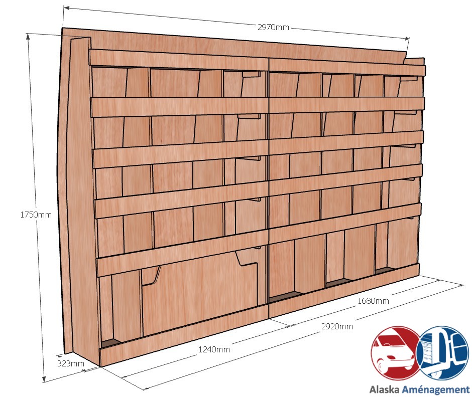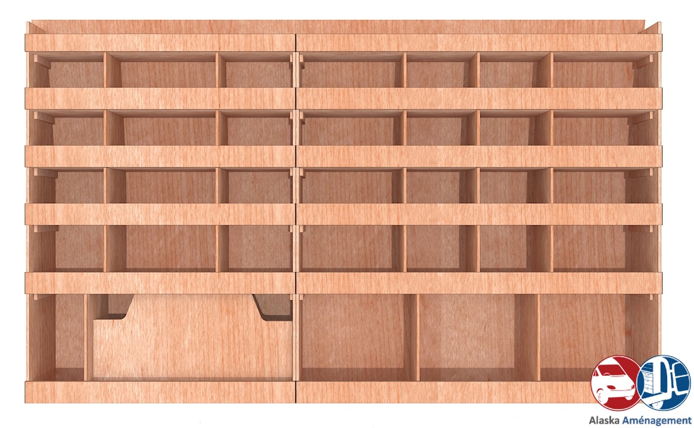 Ce meuble de rangement KRG-N (pour le latéral « Gauche » de votre véhicule) offre une solution de stockage polyvalente et fonctionnelle avec six niveaux de stockage. Il comprend des étagères pour stocker divers équipements et matériels. Une étagère supérieure est conçue pour les objets longs. Son fond arrière intégré assure la rigidité et protège la carrosserie du véhicule, évitant un habillage supplémentaire. Le meuble est disponible en contreplaqué brut ou filmé. |