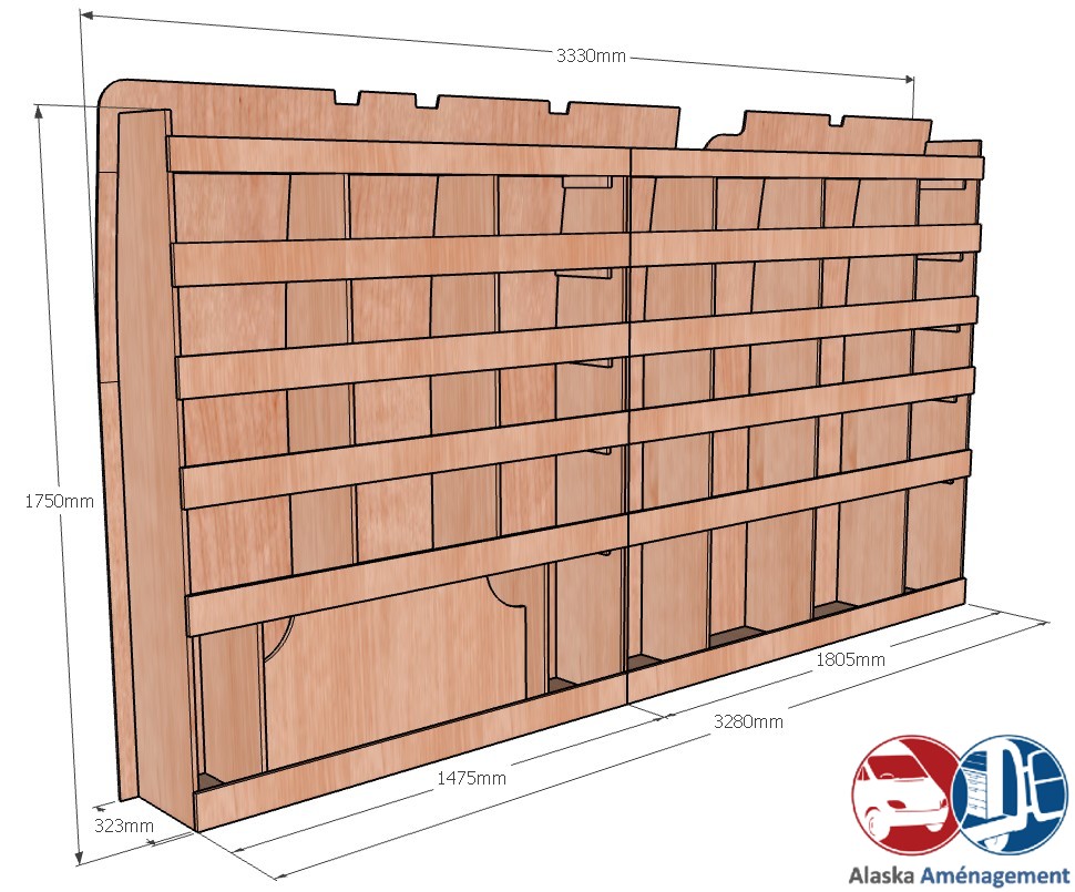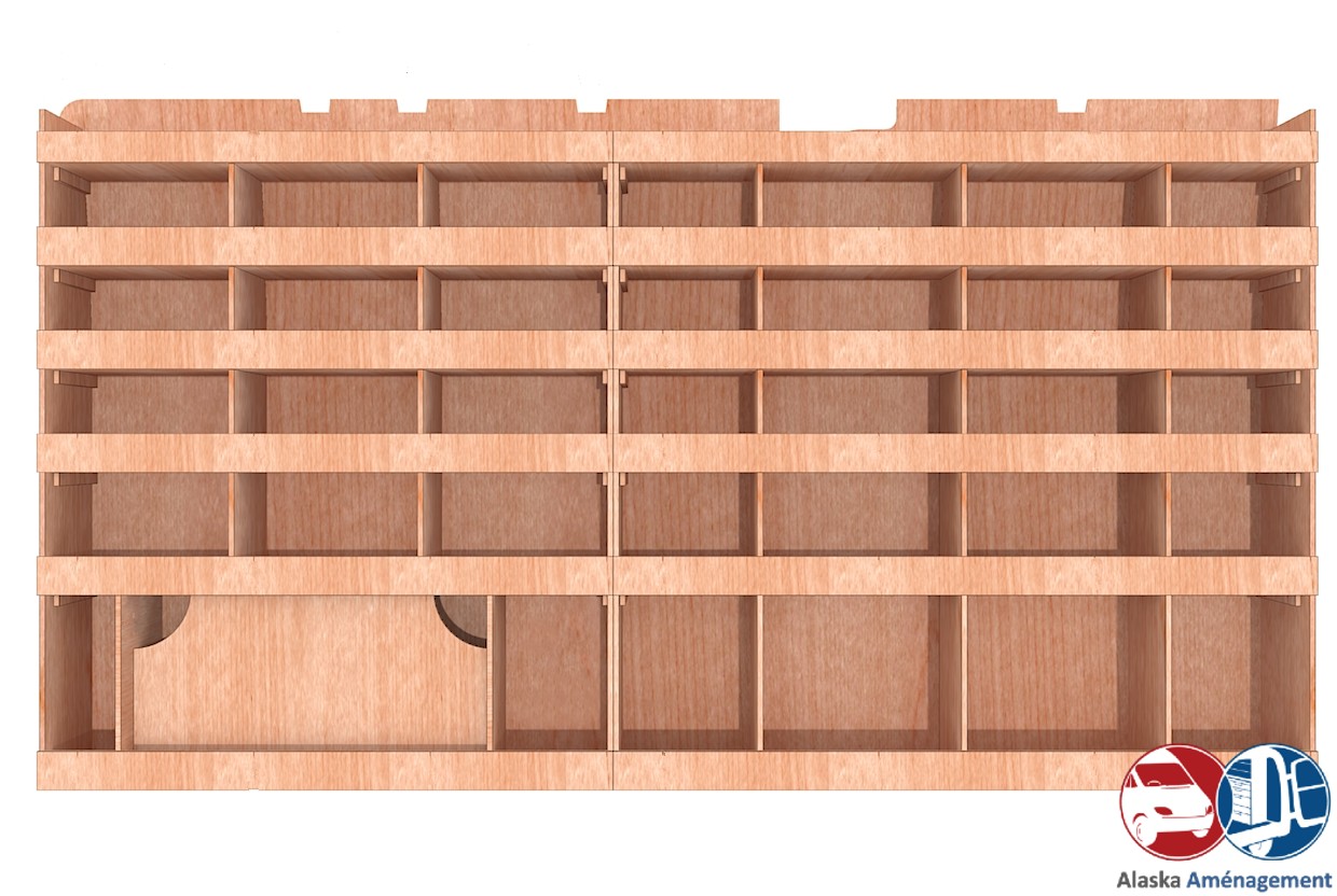 Ce meuble de rangement KRG-N (pour le latéral « Gauche » de votre véhicule) offre une solution de stockage polyvalente et fonctionnelle avec six niveaux de stockage. Il comprend des étagères pour stocker divers équipements et matériels. Une étagère supérieure est conçue pour les objets longs. Son fond arrière intégré assure la rigidité et protège la carrosserie du véhicule, évitant un habillage supplémentaire. Le meuble est disponible en contreplaqué brut ou filmé. |