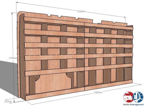 Ce meuble de rangement KRG-N(pour le latéral « Gauche » de votre véhicule) offre une solution de stockage polyvalente et fonctionnelle avec six niveaux de stockage. Il comprend des étagères pour stocker divers équipements et matériels. Une étagère supérieure est conçue pour les objets longs. Son fond arrière intégré assure la rigidité et protège la carrosserie du véhicule, évitant un habillage supplémentaire. Le meuble est disponible en contreplaqué brut ou filmé.