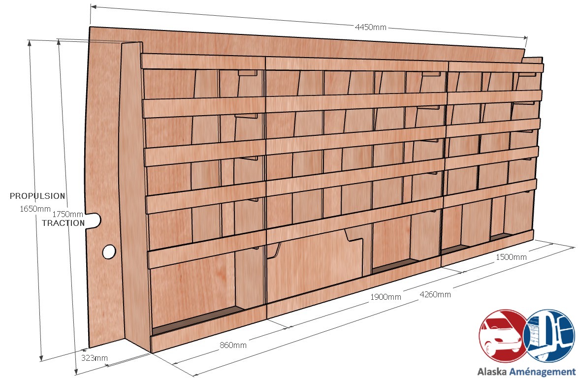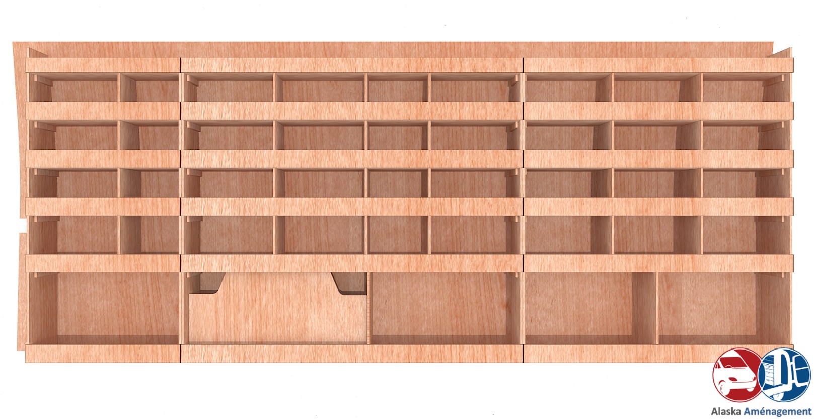Ce meuble de rangement KRG-N (pour le latéral « Gauche » de votre véhicule) offre une solution de stockage polyvalente et fonctionnelle avec six niveaux de stockage. Il comprend des étagères pour stocker divers équipements et matériels. Une étagère supérieure est conçue pour les objets longs. Son fond arrière intégré assure la rigidité et protège la carrosserie du véhicule, évitant un habillage supplémentaire. Le meuble est disponible en contreplaqué brut ou filmé. |