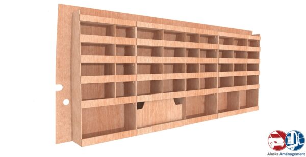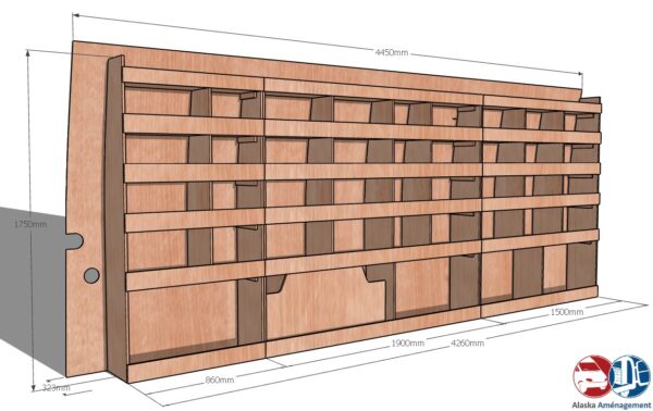 Ce meuble de rangement KRG-N (pour le latéral « Gauche » de votre véhicule) offre une solution de stockage polyvalente et fonctionnelle avec six niveaux de stockage. Il comprend des étagères pour stocker divers équipements et matériels. Une étagère supérieure est conçue pour les objets longs. Son fond arrière intégré assure la rigidité et protège la carrosserie du véhicule, évitant un habillage supplémentaire. Le meuble est disponible en contreplaqué brut ou filmé.