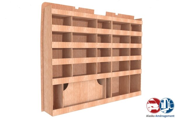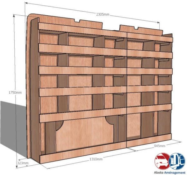 Ce meuble de rangement KRG-N(pour le latéral « Gauche » de votre véhicule) offre une solution de stockage polyvalente et fonctionnelle avec six niveaux de stockage. Il comprend des étagères pour stocker divers équipements et matériels. Une étagère supérieure est conçue pour les objets longs. Son fond arrière intégré assure la rigidité et protège la carrosserie du véhicule, évitant un habillage supplémentaire. Le meuble est disponible en contreplaqué brut ou filmé.