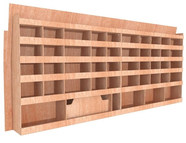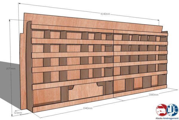 Ce meuble de rangement KRG-N (pour le latéral « Gauche » de votre véhicule) offre une solution de stockage polyvalente et fonctionnelle avec six niveaux de stockage. Il comprend des étagères pour stocker divers équipements et matériels. Une étagère supérieure est conçue pour les objets longs. Son fond arrière intégré assure la rigidité et protège la carrosserie du véhicule, évitant un habillage supplémentaire. Le meuble est disponible en contreplaqué brut ou filmé. |