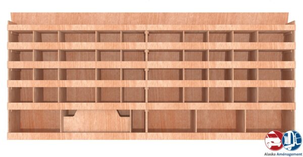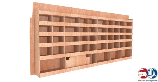 Ce meuble de rangement KRG-N (pour le latéral « Gauche » de votre véhicule) offre une solution de stockage polyvalente et fonctionnelle avec six niveaux de stockage. Il comprend des étagères pour stocker divers équipements et matériels. Une étagère supérieure est conçue pour les objets longs. Son fond arrière intégré assure la rigidité et protège la carrosserie du véhicule, évitant un habillage supplémentaire. Le meuble est disponible en contreplaqué brut ou filmé.