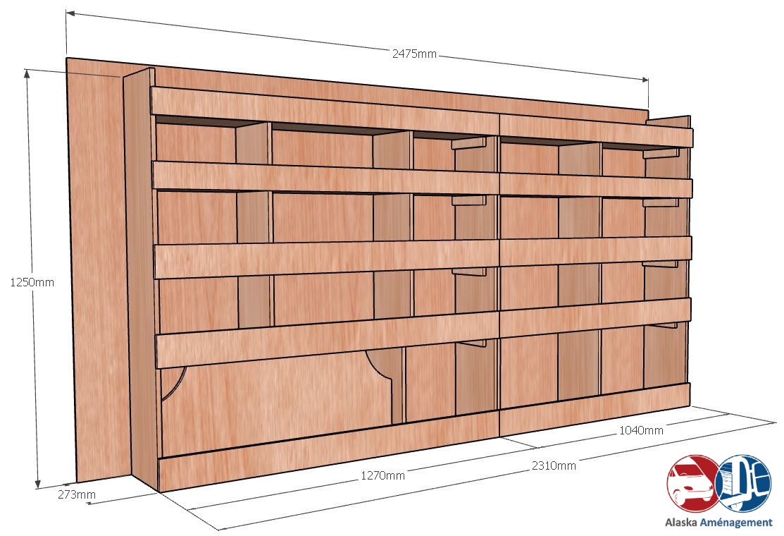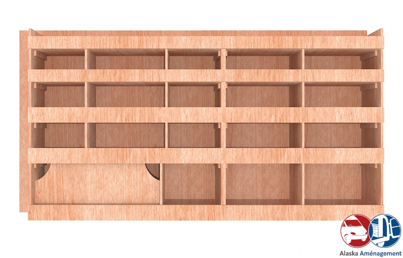 Ce meuble de rangement KRG-N (pour le latéral « Gauche » de votre véhicule) offre une solution de stockage polyvalente et fonctionnelle avec cinq niveaux de stockage. Il comprend des étagères pour stocker divers équipements et matériels. Une étagère supérieure est conçue pour les objets longs. Son fond arrière intégré assure la rigidité et protège la carrosserie du véhicule, évitant un habillage supplémentaire. Le meuble est disponible en contreplaqué brut ou filmé.
