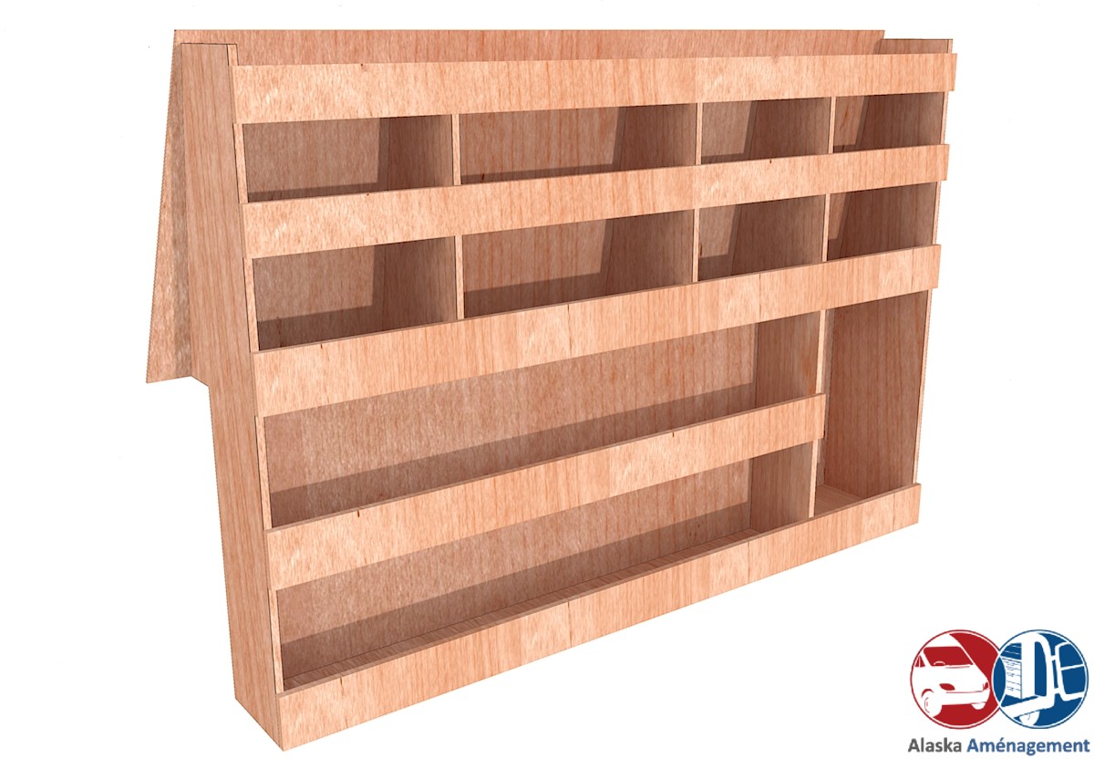 Ce meuble de rangement KRG-N (pour le latéral « Gauche » de votre véhicule) offre une solution de stockage polyvalente et fonctionnelle avec cinq niveaux de stockage. Il comprend des étagères pour stocker divers équipements et matériels. Une étagère supérieure est conçue pour les objets longs. Son fond arrière intégré assure la rigidité et protège la carrosserie du véhicule, évitant un habillage supplémentaire. Le meuble est disponible en contreplaqué brut ou filmé.