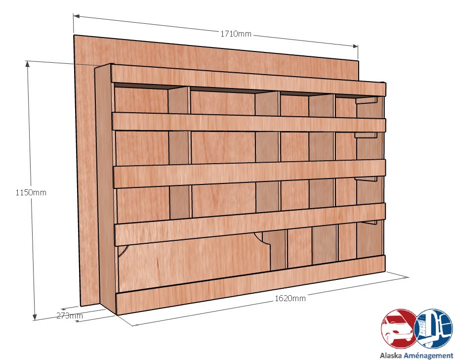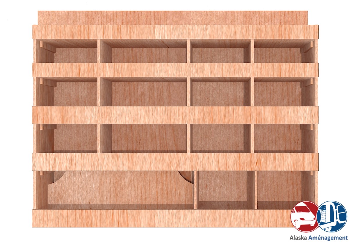 Ce meuble de rangement KRG-N (pour le latéral « Gauche » de votre véhicule) offre une solution de stockage polyvalente et fonctionnelle avec cinq niveaux de stockage. Il comprend des étagères pour stocker divers équipements et matériels. Une étagère supérieure est conçue pour les objets longs. Son fond arrière intégré assure la rigidité et protège la carrosserie du véhicule, évitant un habillage supplémentaire. Le meuble est disponible en contreplaqué brut ou filmé.