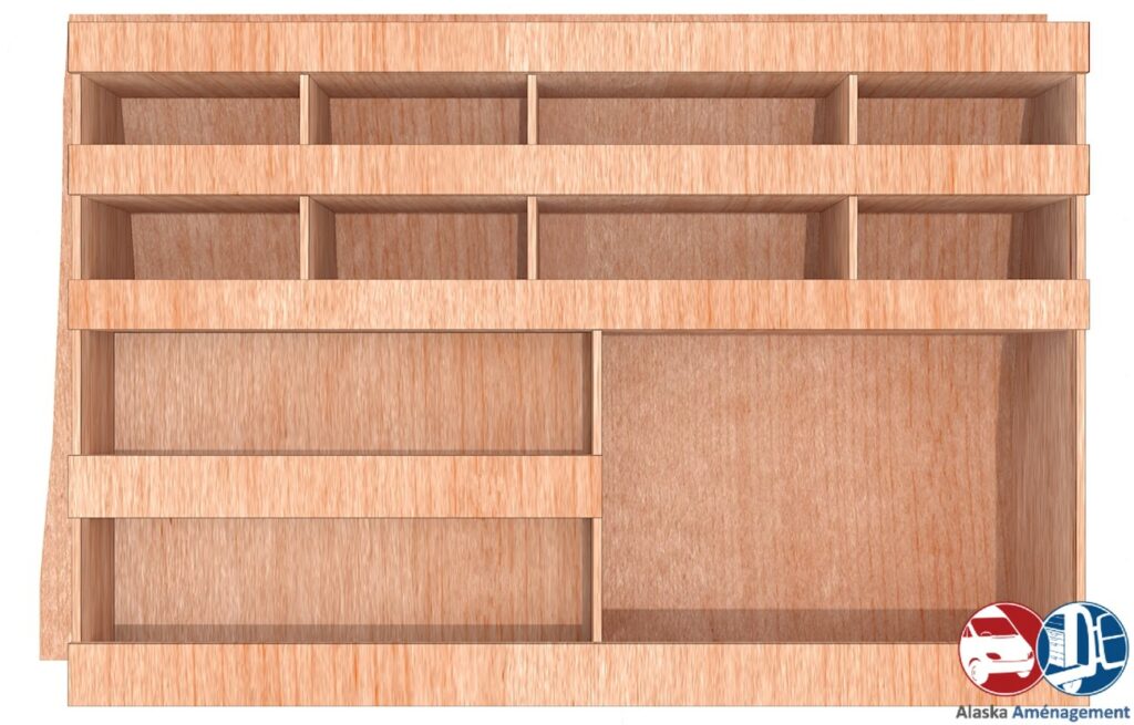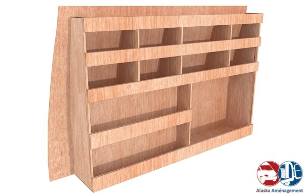 Ce meuble de rangement KRG-N (pour le latéral « Gauche » de votre véhicule) offre une solution de stockage polyvalente et fonctionnelle avec cinq niveaux de stockage. Il comprend des étagères pour stocker divers équipements et matériels. Une étagère supérieure est conçue pour les objets longs. Son fond arrière intégré assure la rigidité et protège la carrosserie du véhicule, évitant un habillage supplémentaire. Le meuble est disponible en contreplaqué brut ou filmé.