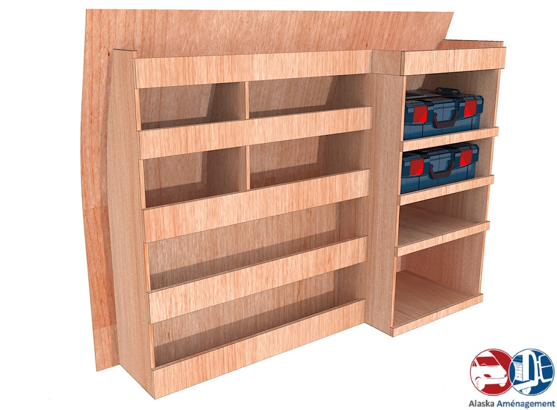 Ce meuble de rangement KRG-N(pour le latéral « Gauche » de votre véhicule) offre une solution de stockage polyvalente et fonctionnelle avec cinq niveaux de stockage. Il comprend des étagères pour stocker divers équipements et matériels. Une étagère supérieure est conçue pour les objets longs. Son fond arrière intégré assure la rigidité et protège la carrosserie du véhicule, évitant un habillage supplémentaire. Le meuble est disponible en contreplaqué brut ou filmé.