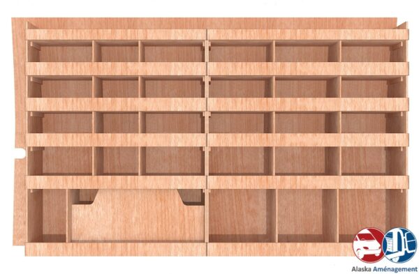 Ce meuble de rangement KRG-N(pour le latéral « Gauche » de votre véhicule) offre une solution de stockage polyvalente et fonctionnelle avec six niveaux de stockage. Il comprend des étagères pour stocker divers équipements et matériels. Une étagère supérieure est conçue pour les objets longs. Son fond arrière intégré assure la rigidité et protège la carrosserie du véhicule, évitant un habillage supplémentaire. Le meuble est disponible en contreplaqué brut ou filmé.