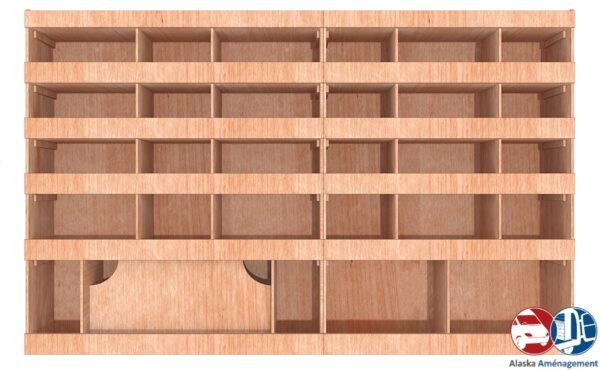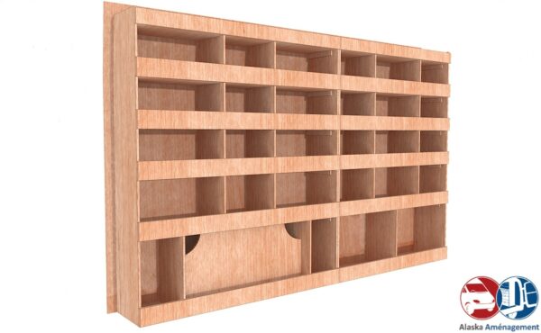 Ce meuble de rangement KRG-N (pour le latéral « Gauche » de votre véhicule) offre une solution de stockage polyvalente et fonctionnelle avec six niveaux de stockage. Il comprend des étagères pour stocker divers équipements et matériels. Une étagère supérieure est conçue pour les objets longs. Son fond arrière intégré assure la rigidité et protège la carrosserie du véhicule, évitant un habillage supplémentaire. Le meuble est disponible en contreplaqué brut ou filmé.