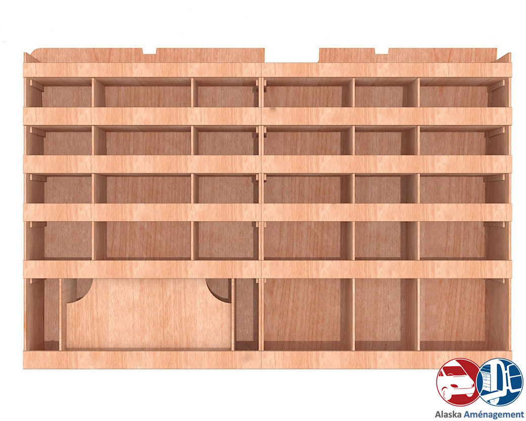 Ce meuble de rangement KRG-N (pour le latéral « Gauche » de votre véhicule) offre une solution de stockage polyvalente et fonctionnelle avec six niveaux de stockage. Il comprend des étagères pour stocker divers équipements et matériels. Une étagère supérieure est conçue pour les objets longs. Son fond arrière intégré assure la rigidité et protège la carrosserie du véhicule, évitant un habillage supplémentaire. Le meuble est disponible en contreplaqué brut ou filmé.