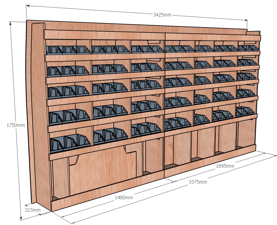 Ce meuble de rangement KRG001-N (pour le latéral « Gauche » de votre véhicule) offre une solution de stockage polyvalente et fonctionnelle avec sept niveaux de stockage. Il comprend des étagères pour bacs à bec pour ranger toutes vos petites pièces. Une étagère supérieure est conçue pour les objets longs. Son fond arrière intégré assure la rigidité et protège la carrosserie du véhicule, évitant un habillage supplémentaire. Le meuble est disponible en contreplaqué brut ou filmé. |