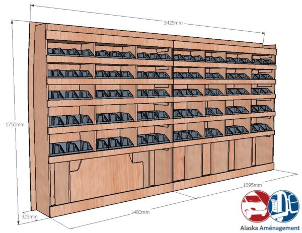 Ce meuble de rangement KRG001-N (pour le latéral « Gauche » de votre véhicule) offre une solution de stockage polyvalente et fonctionnelle avec sept niveaux de stockage. Il comprend des étagères pour bacs à bec pour ranger toutes vos petites pièces. Une étagère supérieure est conçue pour les objets longs. Son fond arrière intégré assure la rigidité et protège la carrosserie du véhicule, évitant un habillage supplémentaire. Le meuble est disponible en contreplaqué brut ou filmé.
