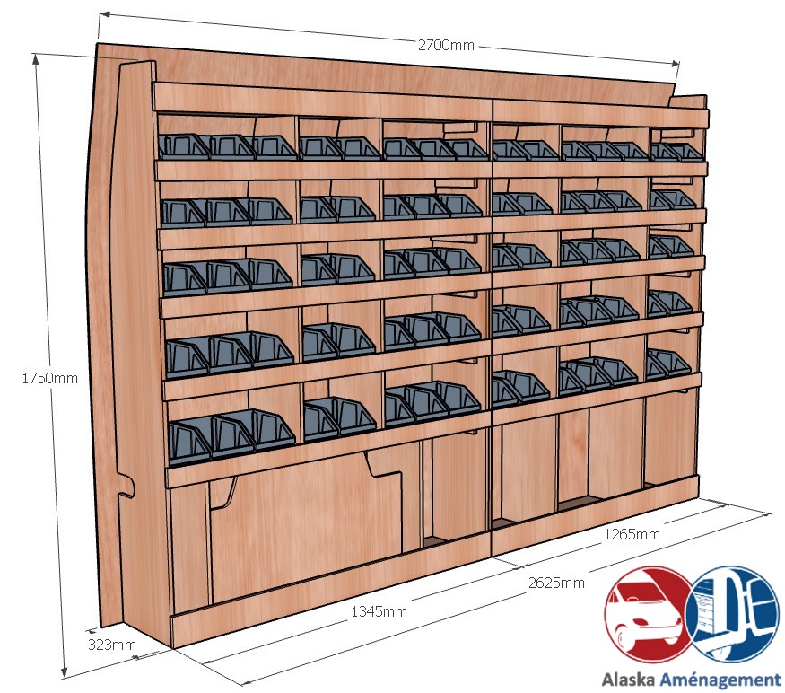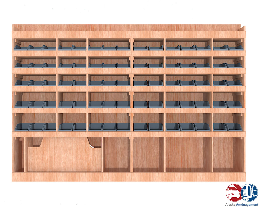 Ce meuble de rangement KRG001-N (pour le latéral « Gauche » de votre véhicule) offre une solution de stockage polyvalente et fonctionnelle avec sept niveaux de stockage. Il comprend des étagères pour bacs à bec pour ranger toutes vos petites pièces. Une étagère supérieure est conçue pour les objets longs. Son fond arrière intégré assure la rigidité et protège la carrosserie du véhicule, évitant un habillage supplémentaire. Le meuble est disponible en contreplaqué brut ou filmé.