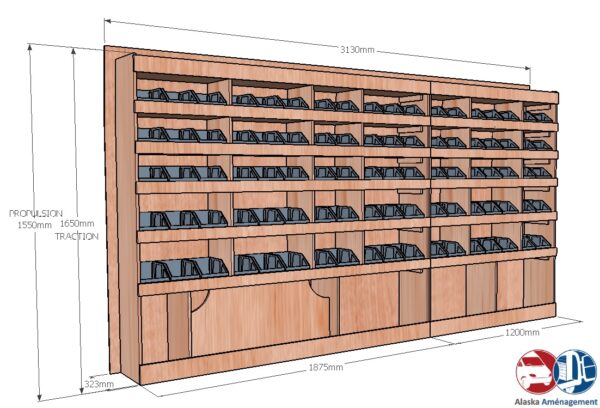 Ce meuble de rangement KRG001-N (pour le latéral « Gauche » de votre véhicule) offre une solution de stockage polyvalente et fonctionnelle avec sept niveaux de stockage. Il comprend des étagères pour bacs à bec pour ranger toutes vos petites pièces. Une étagère supérieure est conçue pour les objets longs. Son fond arrière intégré assure la rigidité et protège la carrosserie du véhicule, évitant un habillage supplémentaire. Le meuble est disponible en contreplaqué brut ou filmé.