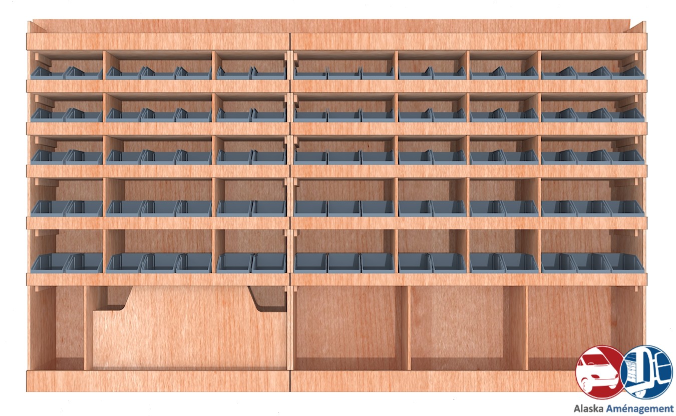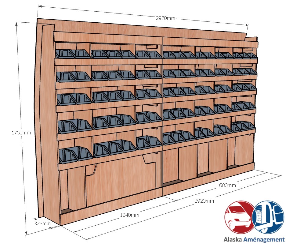 Ce meuble de rangement KRG001-N (pour le latéral « Gauche » de votre véhicule) offre une solution de stockage polyvalente et fonctionnelle avec sept niveaux de stockage. Il comprend des étagères pour bacs à bec pour ranger toutes vos petites pièces. Une étagère supérieure est conçue pour les objets longs. Son fond arrière intégré assure la rigidité et protège la carrosserie du véhicule, évitant un habillage supplémentaire. Le meuble est disponible en contreplaqué brut ou filmé. |