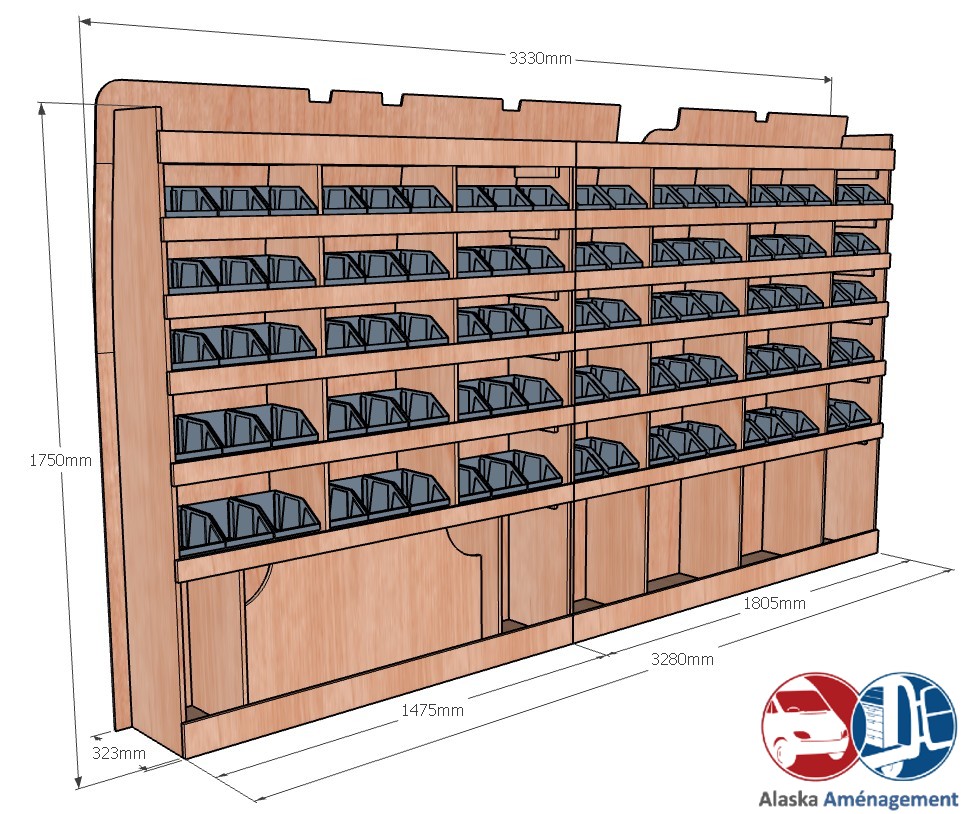 Ce meuble de rangement KRG001-N (pour le latéral « Gauche » de votre véhicule) offre une solution de stockage polyvalente et fonctionnelle avec sept niveaux de stockage. Il comprend des étagères pour bacs à bec pour ranger toutes vos petites pièces. Une étagère supérieure est conçue pour les objets longs. Son fond arrière intégré assure la rigidité et protège la carrosserie du véhicule, évitant un habillage supplémentaire. Le meuble est disponible en contreplaqué brut ou filmé. |
