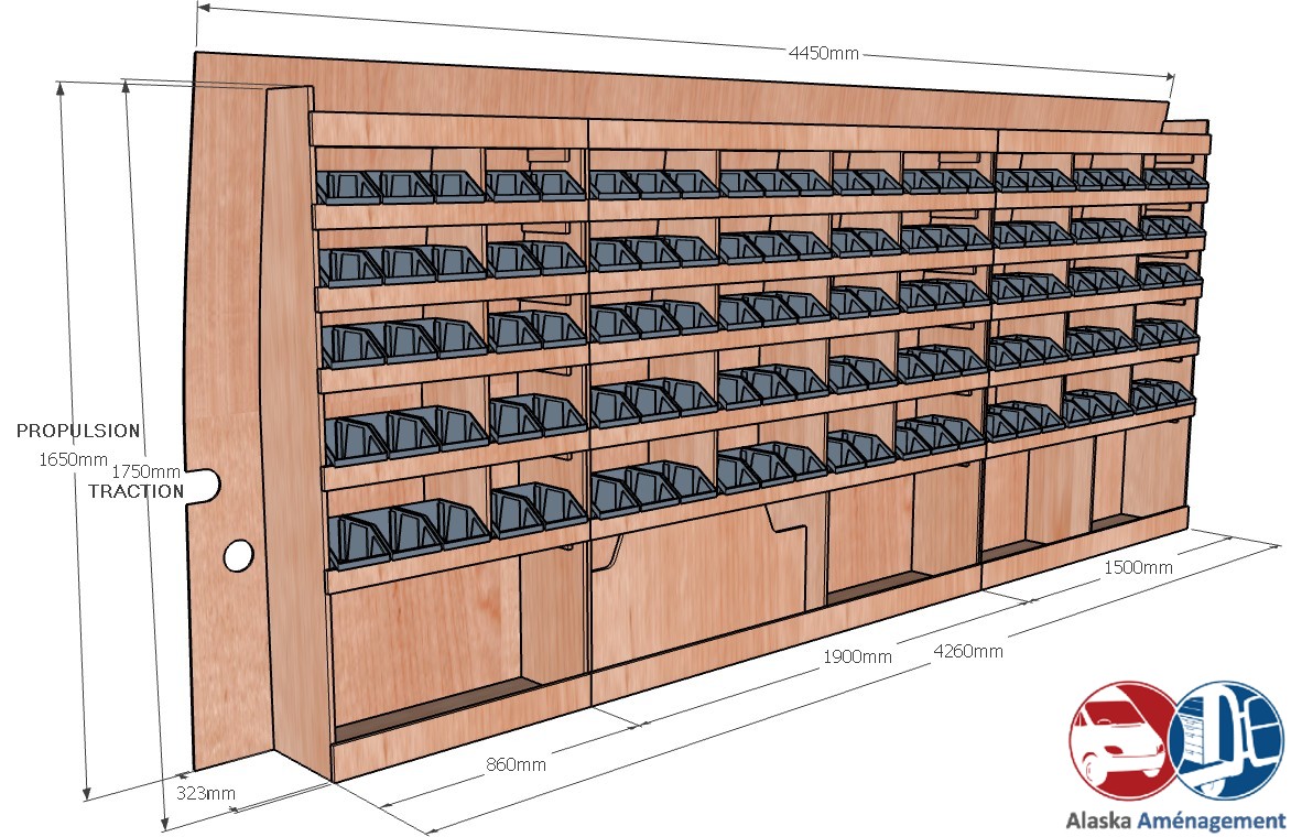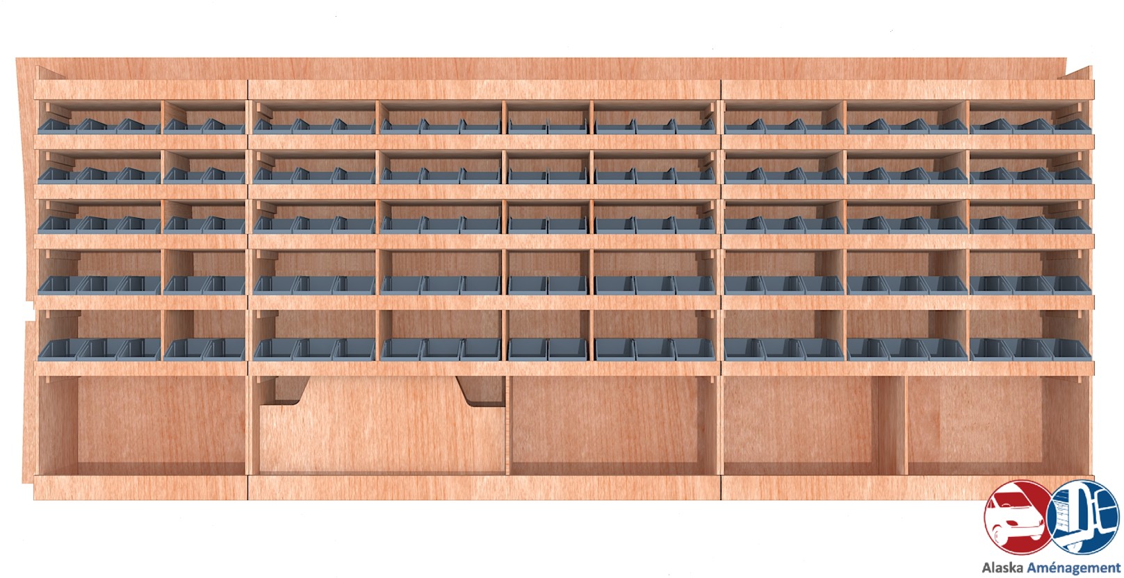 Ce meuble de rangement KRG001-N (pour le latéral « Gauche » de votre véhicule) offre une solution de stockage polyvalente et fonctionnelle avec sept niveaux de stockage. Il comprend des étagères pour bacs à bec pour ranger toutes vos petites pièces. Une étagère supérieure est conçue pour les objets longs. Son fond arrière intégré assure la rigidité et protège la carrosserie du véhicule, évitant un habillage supplémentaire. Le meuble est disponible en contreplaqué brut ou filmé.