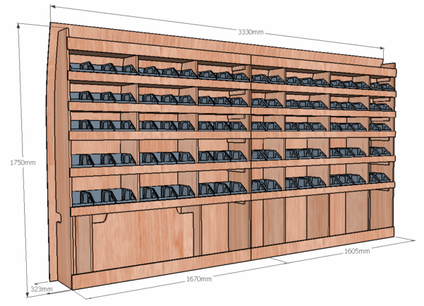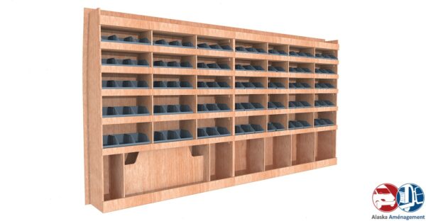 Ce meuble de rangement KRG001-N (pour le latéral « Gauche » de votre véhicule) offre une solution de stockage polyvalente et fonctionnelle avec sept niveaux de stockage. Il comprend des étagères pour bacs à bec pour ranger toutes vos petites pièces. Une étagère supérieure est conçue pour les objets longs. Son fond arrière intégré assure la rigidité et protège la carrosserie du véhicule, évitant un habillage supplémentaire. Le meuble est disponible en contreplaqué brut ou filmé.