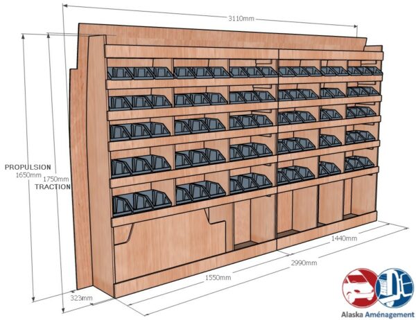 Ce meuble de rangement KRG001-N (pour le latéral « Gauche » de votre véhicule) offre une solution de stockage polyvalente et fonctionnelle avec sept niveaux de stockage. Il comprend des étagères pour bacs à bec pour ranger toutes vos petites pièces. Une étagère supérieure est conçue pour les objets longs. Son fond arrière intégré assure la rigidité et protège la carrosserie du véhicule, évitant un habillage supplémentaire. Le meuble est disponible en contreplaqué brut ou filmé. |